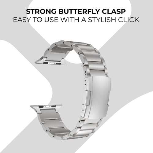 The titanium strap has a folding clasp which is easy to open and close, but durable enough to withstand anything. The titanium strap gives your Apple Watch a traditional watch appearance with a nice premium look & feel.